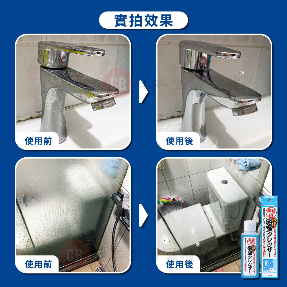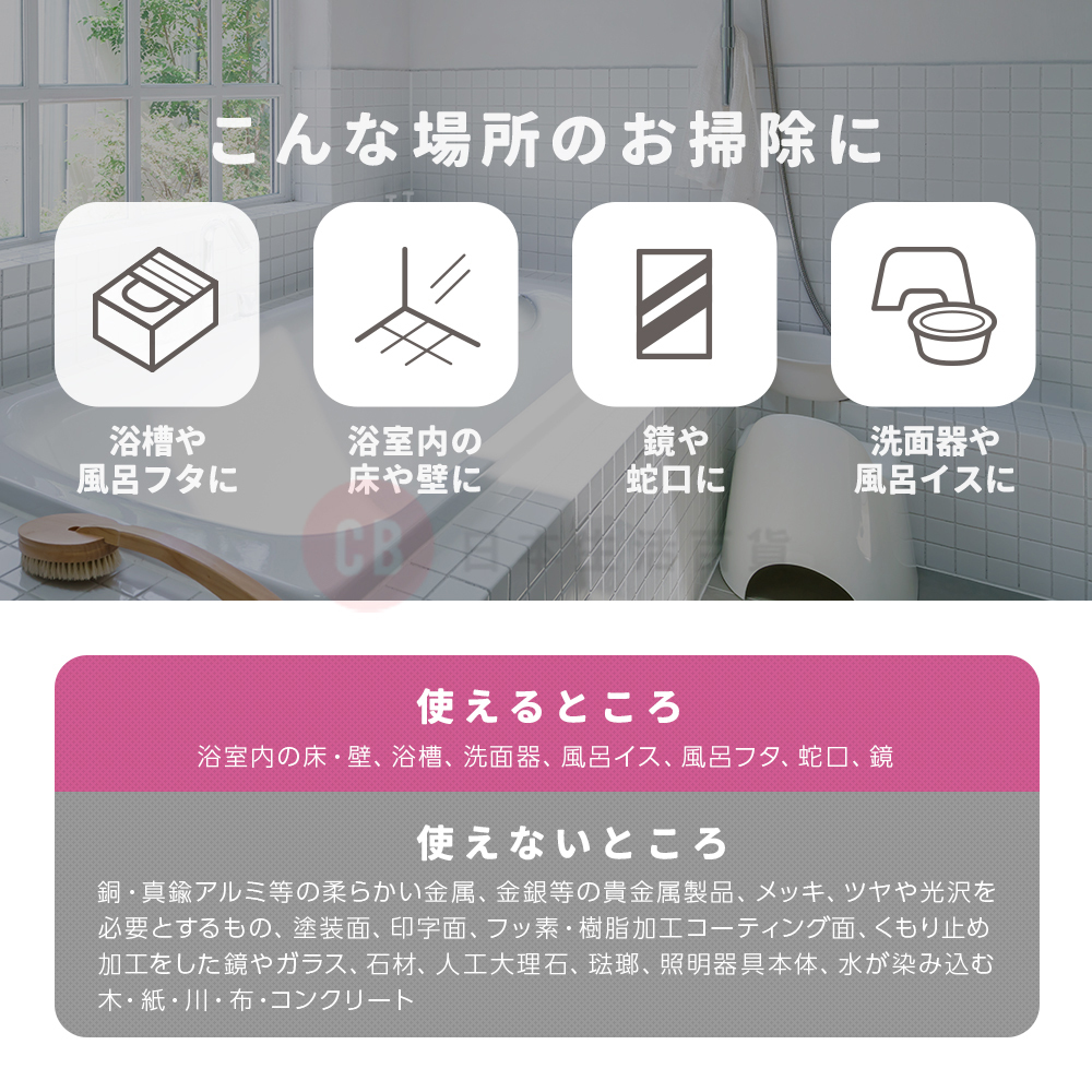 • 適用於浴室鏡、浴屏、水龍頭、浴缸、膠地板、牆磚等
