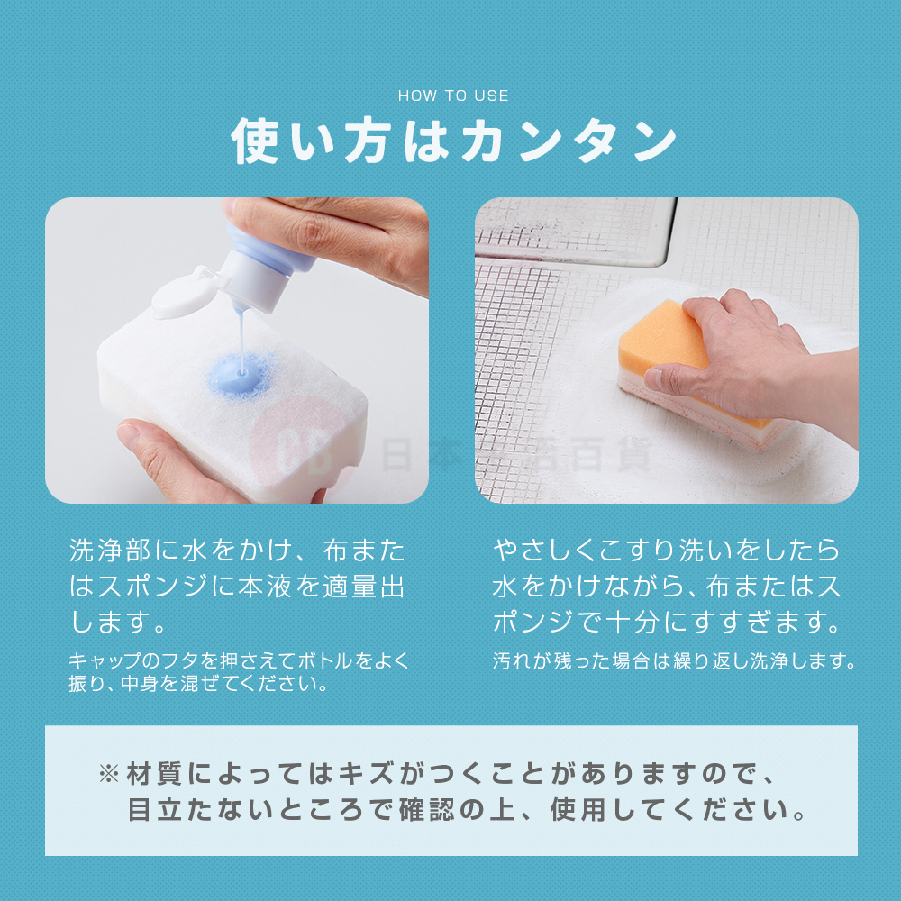 • 請不要用於銅、黃銅、鋁等軟金屬,金、銀等貴金屬製品、電鍍、需要光澤的物品、塗漆表面、印刷表面、氟/樹脂塗層表面、防霧加工的鏡和玻璃、石頭、人造大理石、搪瓷、照明設備主體、木材、紙張、皮革、布料、浸水混凝土的表面