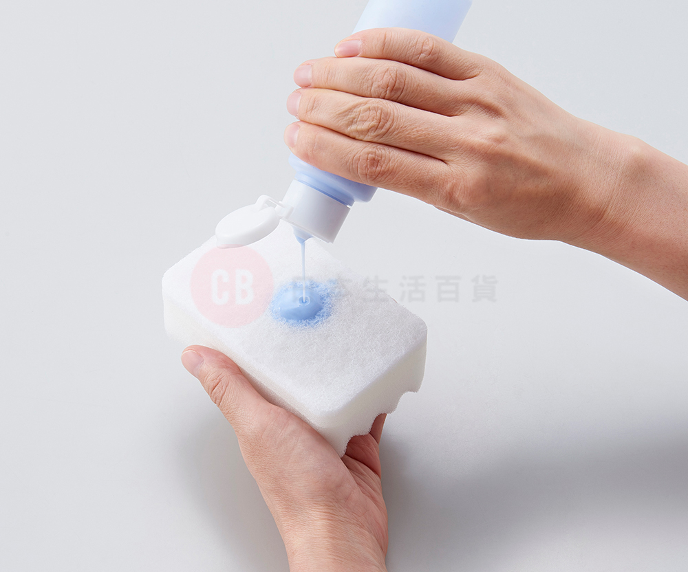 • 將清潔液搖勻後,擠適量到清潔海綿上