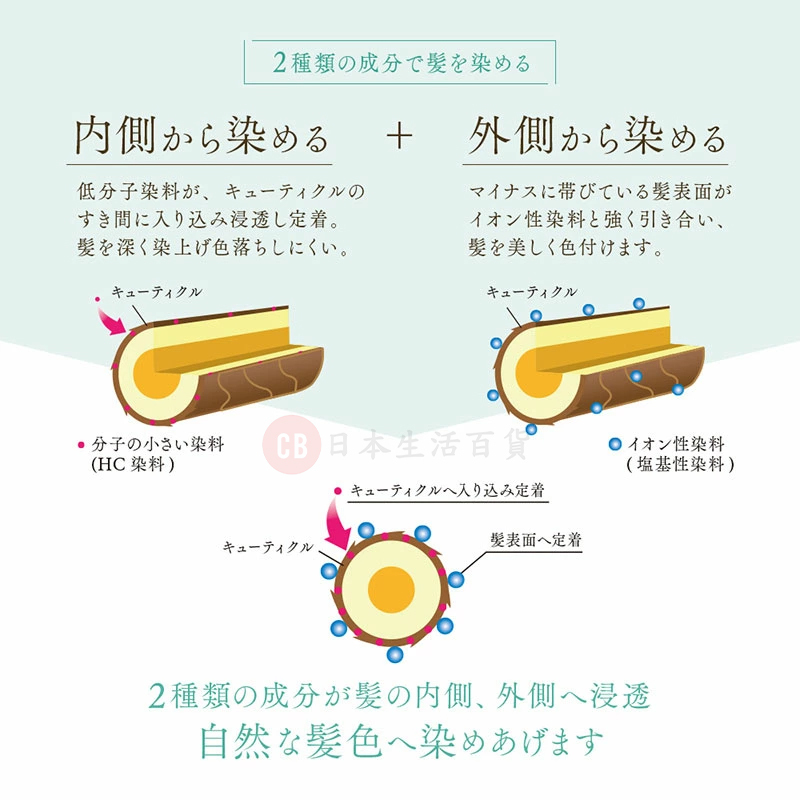 • 利用離子結合方式,將顏色完整地鎖於頭髮表層,而不傷髮芯