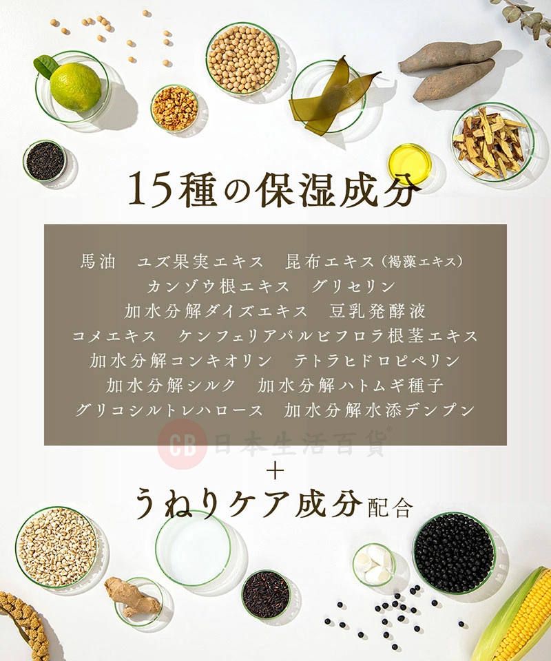 • 鯨蠟硬脂醇、甘油、棕櫚酸異丙酯、鯨蠟醇、硬脂醇、棕櫚烷基酯、馬油、水解大豆提取物、發酵豆漿、大米提取物、小茴香根莖、貝殼素、四氫胡椒鹼、褐藻、蠶絲、柚子果、蜜蜂、膠原蛋白、海藻糖、水解氫化澱粉等