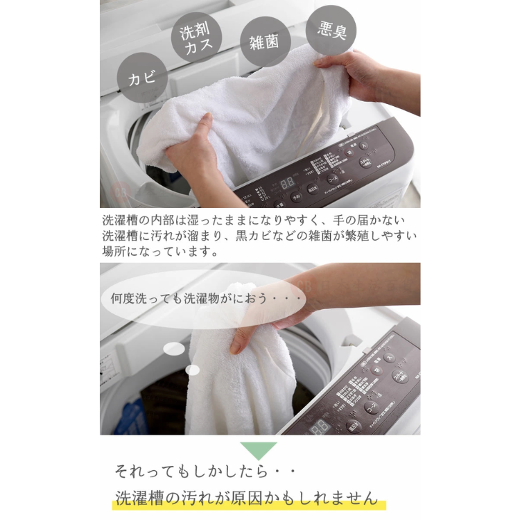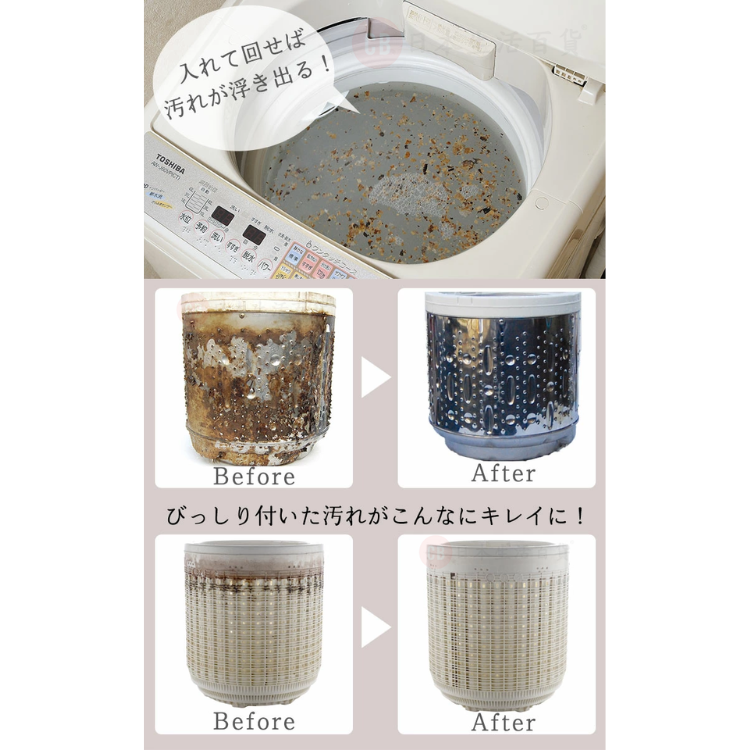 有效去除洗衣機內膽積聚的頑固污穢、油脂、線頭、洗滌劑殘餘物、細菌、黑黴菌等,有消臭抗菌效果。