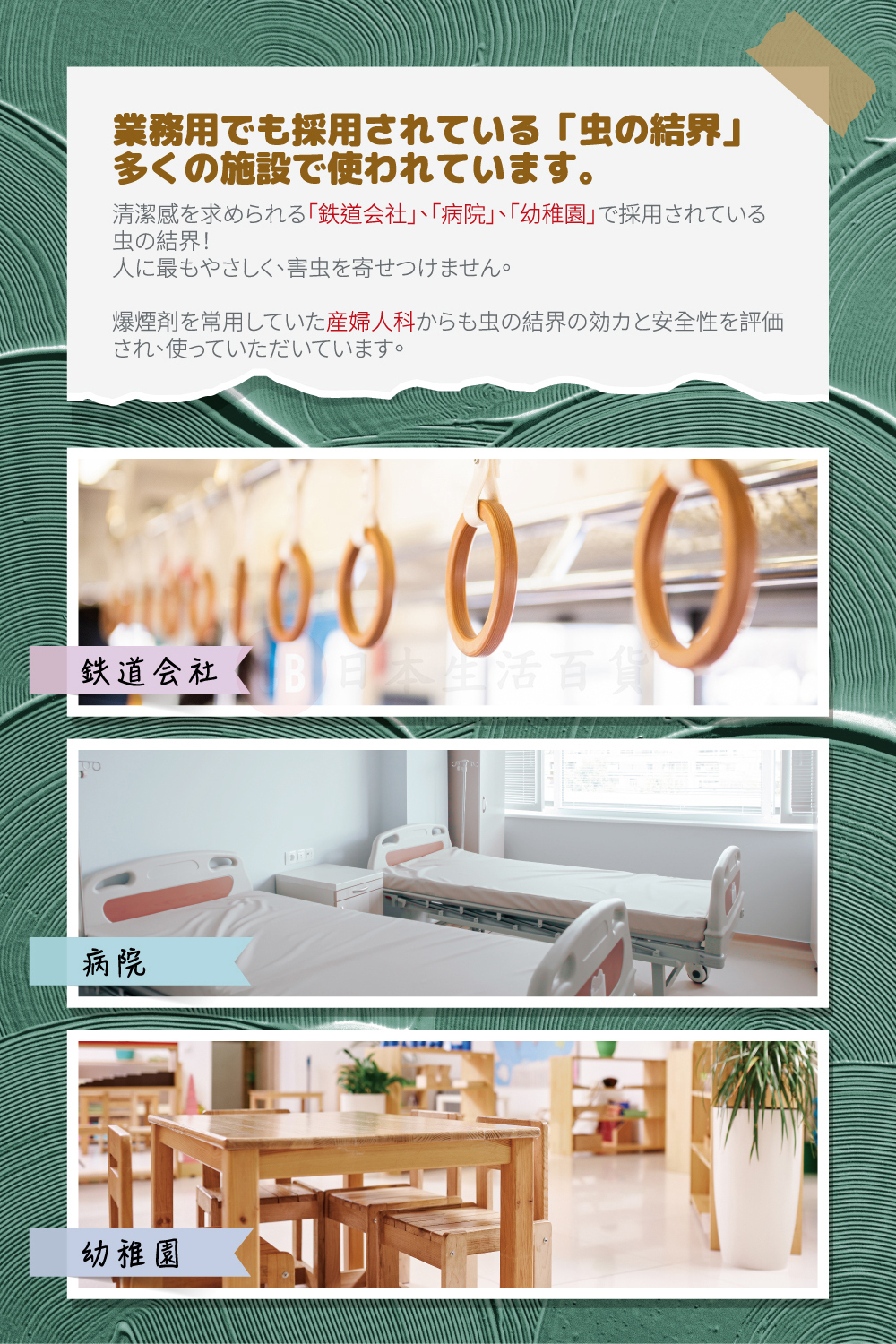 • 獲日本JR鐵路公司、醫院、幼兒園等機構使用超過10年,效果被受讚賞