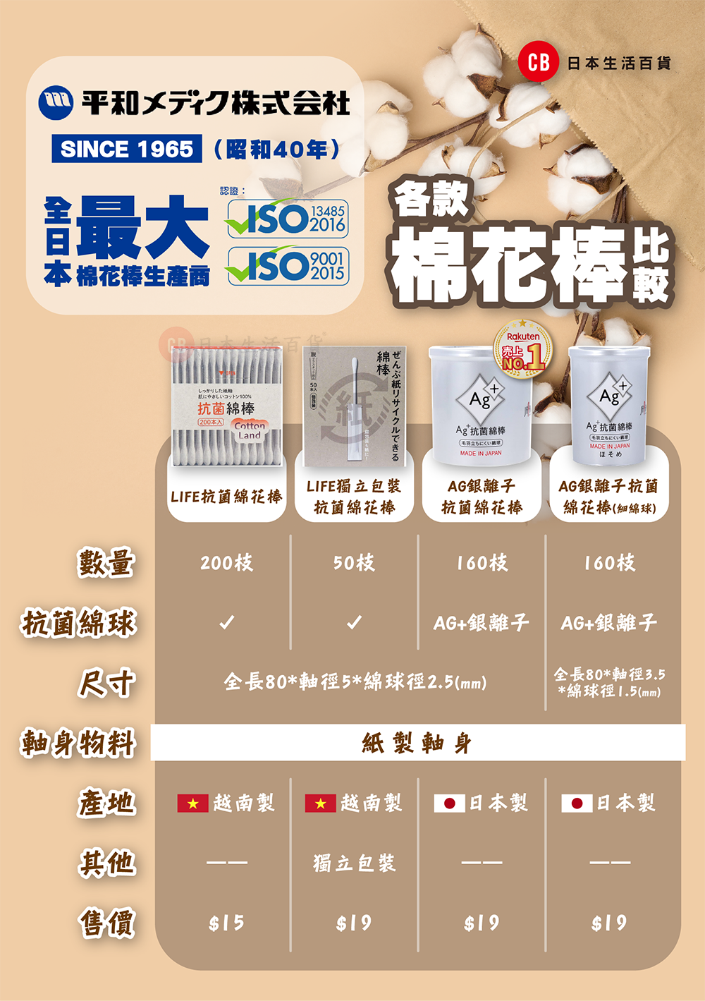 - 日本最大的棉花棒生產商,自1965年起專注於製造棉花棒
