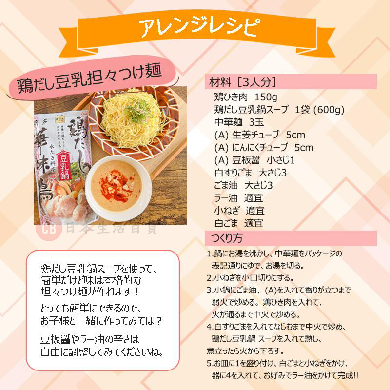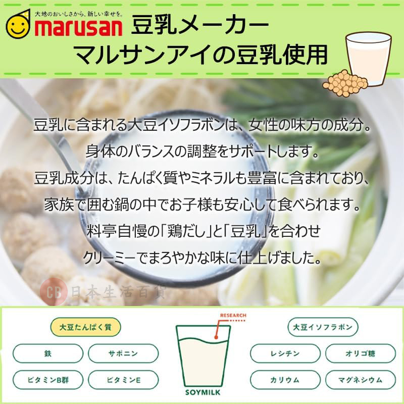 原材料:豆漿(日本國產)、雞湯、豬肉萃取、食鹽、高果糖漿、砂糖、鰹魚萃取物、發酵米調味料、乳主要成分食品、扇貝萃取物、海帶萃取物、味噌/增稠劑(改性澱粉)、調味料(胺基酸等)、(含乳製品、大豆、雞肉、豬肉)